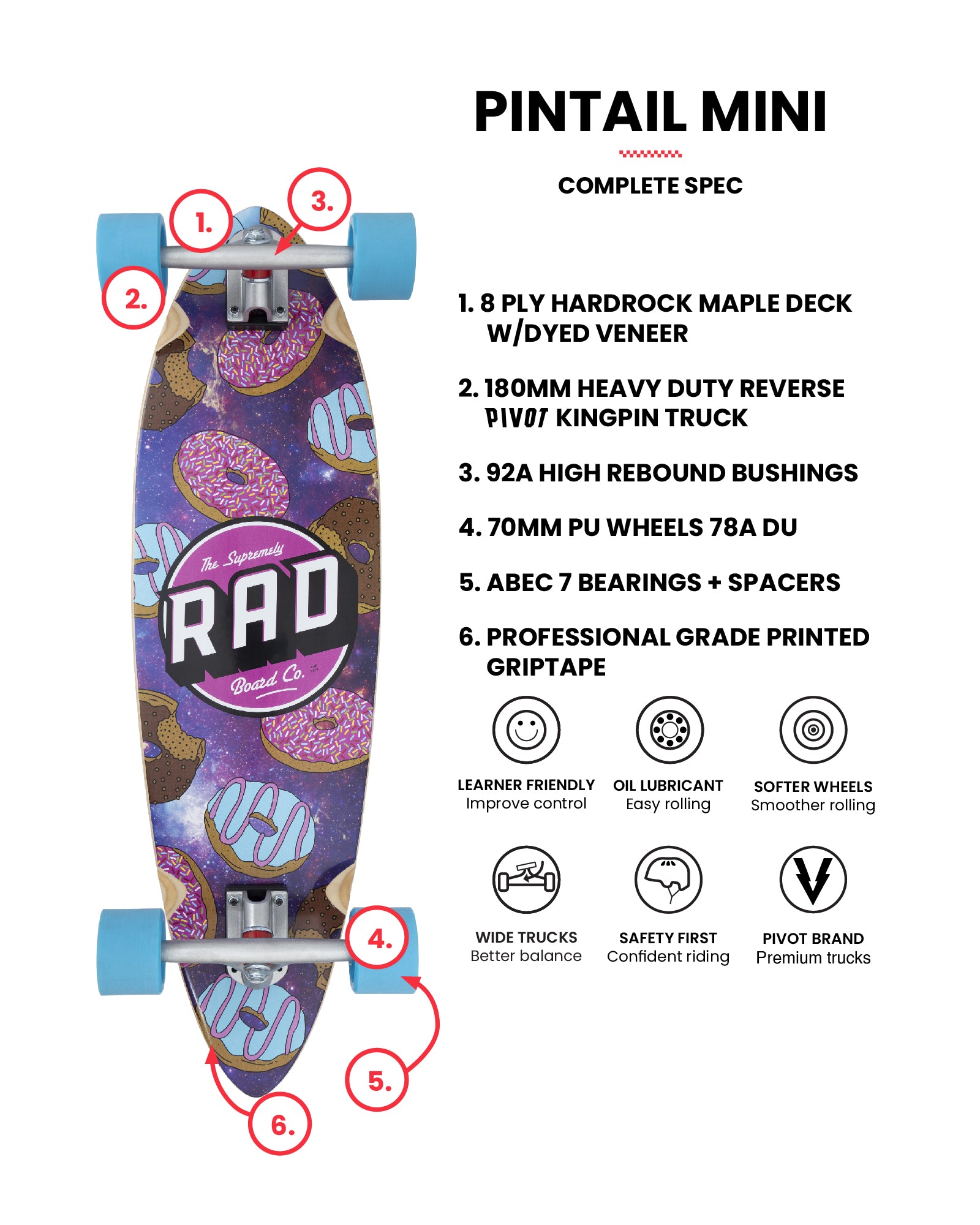 The Rad Board Co. Pintail Mini is one size that pleases all boards. Developed by our bro’s & pro’s, this compact size is to always keep with you. Classic Pintail shape & wide inverted trucks give you enhanced maneuverability for however epic you want your journey to be. Big soft & wide wheels give you the grip and control you need for a daydream cruise.